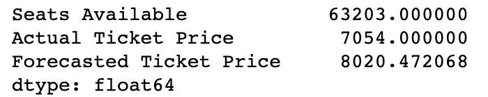The forecasted pricing is bound to have outliers that must be manually modified. Still, for the most part, we see the ticket price increase where seat availability is lower and sometimes also a decrease than the actual price when availability is low.