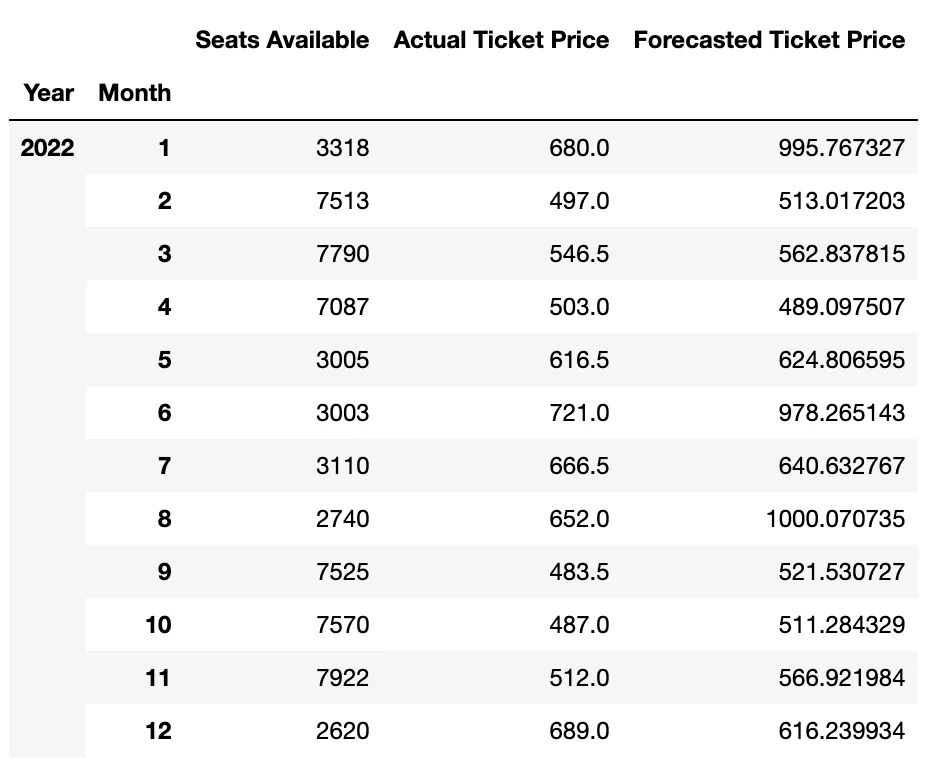 We will train the model on the dataset for 2020 and 2021 and then test how it would have priced tickets for 2022. Here’s the code for the same.